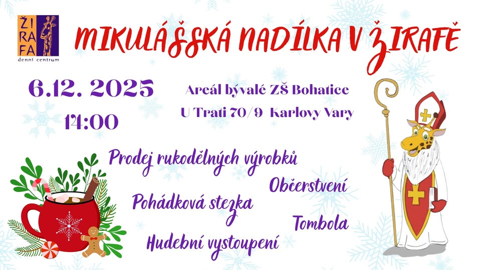 Milí přátelé, rádi bychom Vás a Vaše nejbližší pozvali na Mikulášskou nadílku v areálu Denního centra Žirafa.